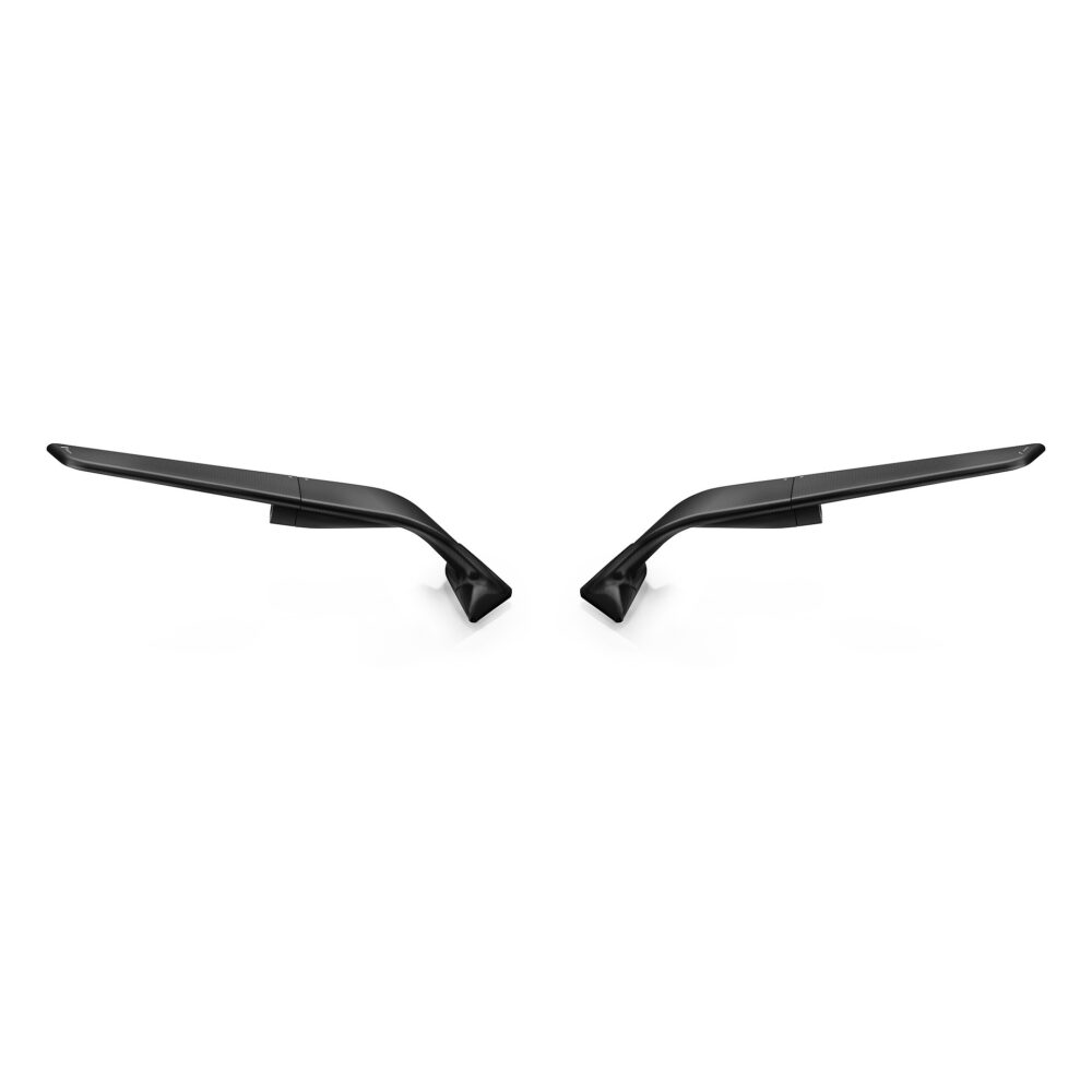 Due elementi: una base fissa integrata nella carena e un corpo mobile che custodisce il vetro. Un solo gesto e l’architettura si compatta, trasformando lo specchio in un’ala aerodinamica. Il risultato: deportanza tangibile, fino a 4 kg a 300 km/h. Fresato da un blocco unico di alluminio, rifinito con anodizzazioni profonde, è dotato di lente HD convessa azzurrata, per una visione nitida e senza riflessi.