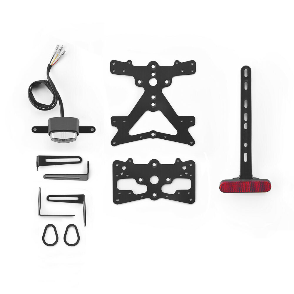 Kit mit eine Kennzeichenplatte 173 x 173 mm und eine US-Kennzeichenplatte 166 x 89,5 mm, Adaptern für OEM-/Rizoma-Blinker, Rücklicht mit integrierter (straßenzugelassene) LED-SMD-Kennzeichenbeleuchtung und Reflektor. Zwei Montageoptionen: Rizoma-Rücklicht und OEM-Blinker; Rizoma-Rücklicht und Rizoma-Normalblinker (erfordert Verkabelung EE088H).
