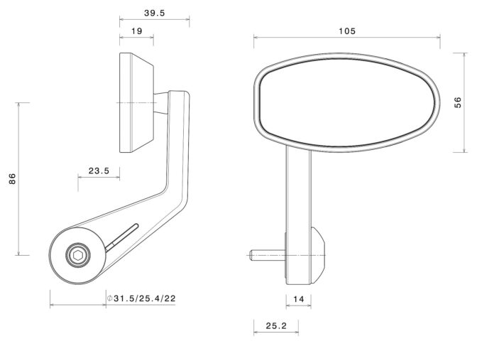 Die End-Mount-Spiegel sind mit allen Lenkern kompatibel, die ein M6-Endgewinde aufweisen. Für Lenker mit einem Innendurchmesser von 13,5 bis 20 mm wird der Montagesatz LP200B benötigt. Für Lenker mit einem Innendurchmesser von 21 bis 23 mm wird der Montagesatz BS830B benötigt.