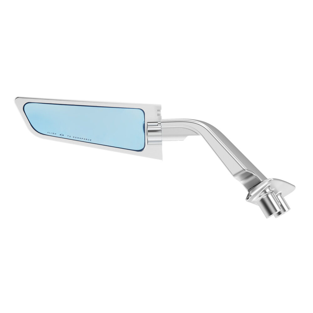 Drei Elemente: eine feste Basis, die in die Verkleidung integriert ist, ein schwenkbarer Arm zum Einklappen des Spiegels nach innen und ein beweglicher Körper, der das Glas schützt. Mit einer einzigen Bewegung verdichtet sich die Struktur und verwandelt den Spiegel in einen aerodynamischen Flügel. Das Ergebnis: spürbarer Abtrieb, bis zu 4 kg bei 300 km/h. Aus einem einzigen Aluminiumblock gefräst und mit tiefgehender Eloxierung veredelt, verfügt es über eine konvexe HD-blaugetönte Linse für eine klare, blendfreie Sicht.