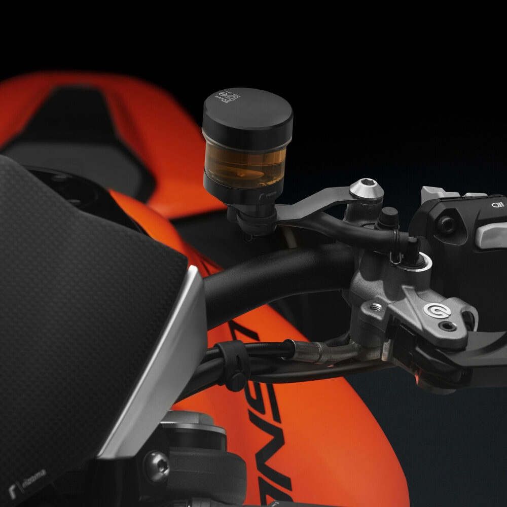 The mounting kit includes two stainless steel screws, specifically machined from billet. It allows the correct re-mounting of the OEM front brake and clutch fluid reservoirs when replacing the OEM...