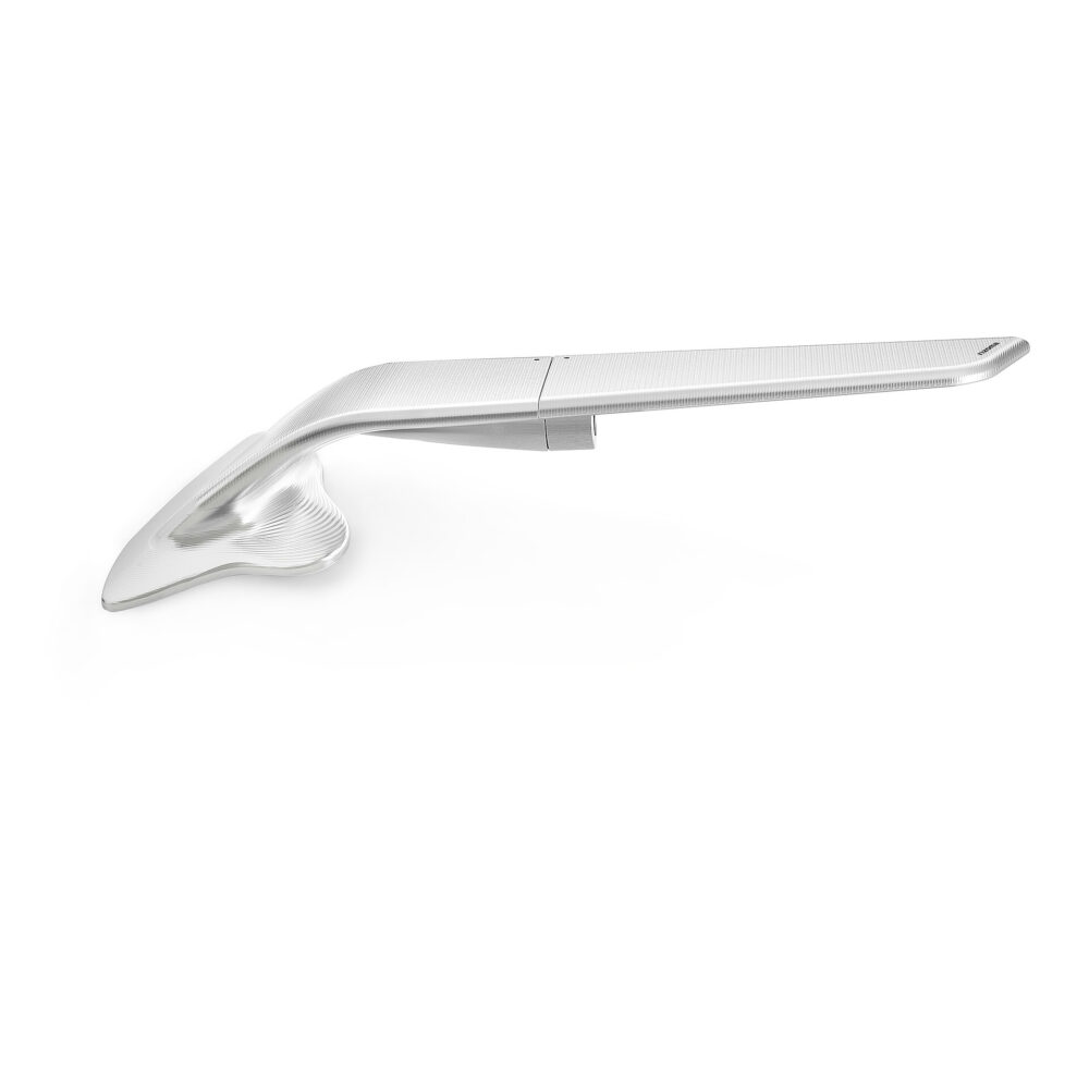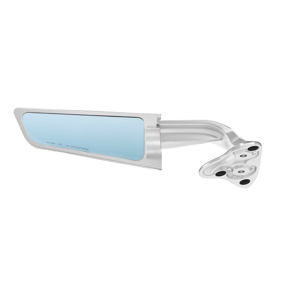 Two elements: a fixed base integrated into the fairing and a movable body that houses the glass. With a single motion, the structure compacts, transforming the mirror into an aerodynamic wing. The result: tangible downforce, up to 4 kg at 300 km/h. Milled from a single block of aluminum and finished with deep anodization, it features a convex HD blue-tinted lens for a sharp, glare-free view.
