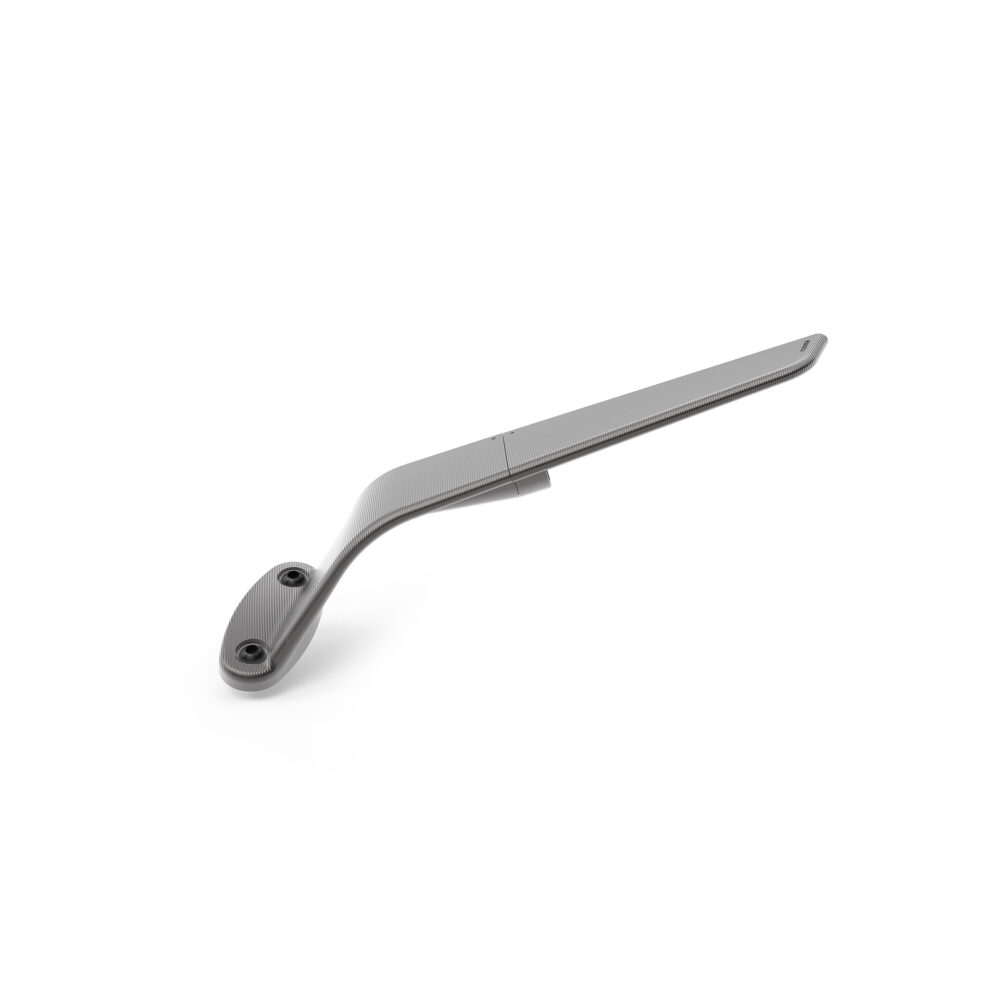Two elements: a fixed base integrated into the fairing and a movable body that houses the glass. With a single motion, the structure compacts, transforming the mirror into an aerodynamic wing. The result: tangible downforce, up to 4 kg at 300 km/h. Milled from a single block of aluminum and finished with deep anodization, it features a convex HD blue-tinted lens for a sharp, glare-free view.