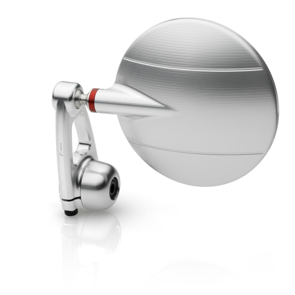 El espejo retrovisor Spy-Arm está fabricado en aluminio mecanizado a partir de un bloque macizo mediante un proceso 3D de precisión. Cristal convexo antideslumbrante, que ayuda a mejorar la visión, junto a unas líneas poco habituales. El Spy-Arm está disponible en dos dimensiones: diámetro 80 mm para la versión más compacta y diámetro 94,5 mm que cumple los requisitos de homologación europea. El sistema de regulación ha sido estudiado para ofrecer la máxima versatilidad.