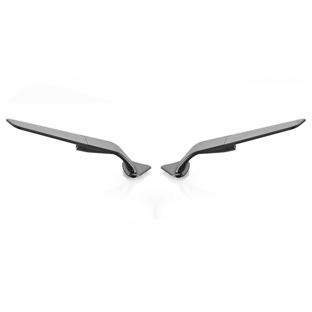 Dos elementos: una base fija integrada en el carenado y un cuerpo móvil que alberga el cristal. Con un solo movimiento, la estructura se compacta, transformando el espejo en un ala aerodinámica. El resultado: carga aerodinámica tangible, hasta 4 kg a 300 km/h. Fresado a partir de un solo bloque de aluminio y acabado con una anodización profunda, cuenta con una lente convexa HD con tinte azul para una visión nítida y sin reflejos.