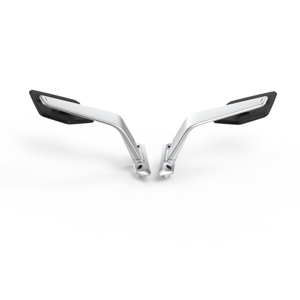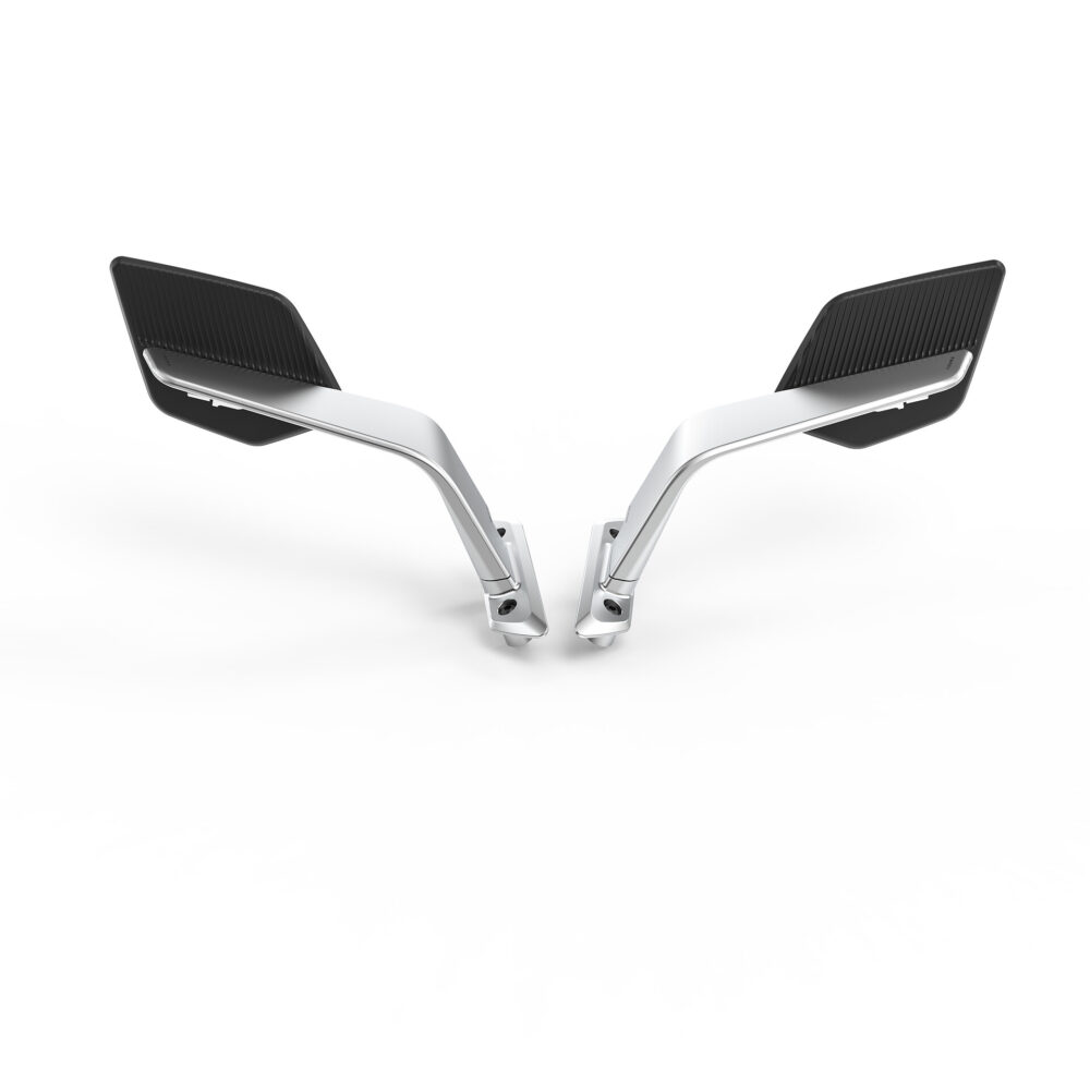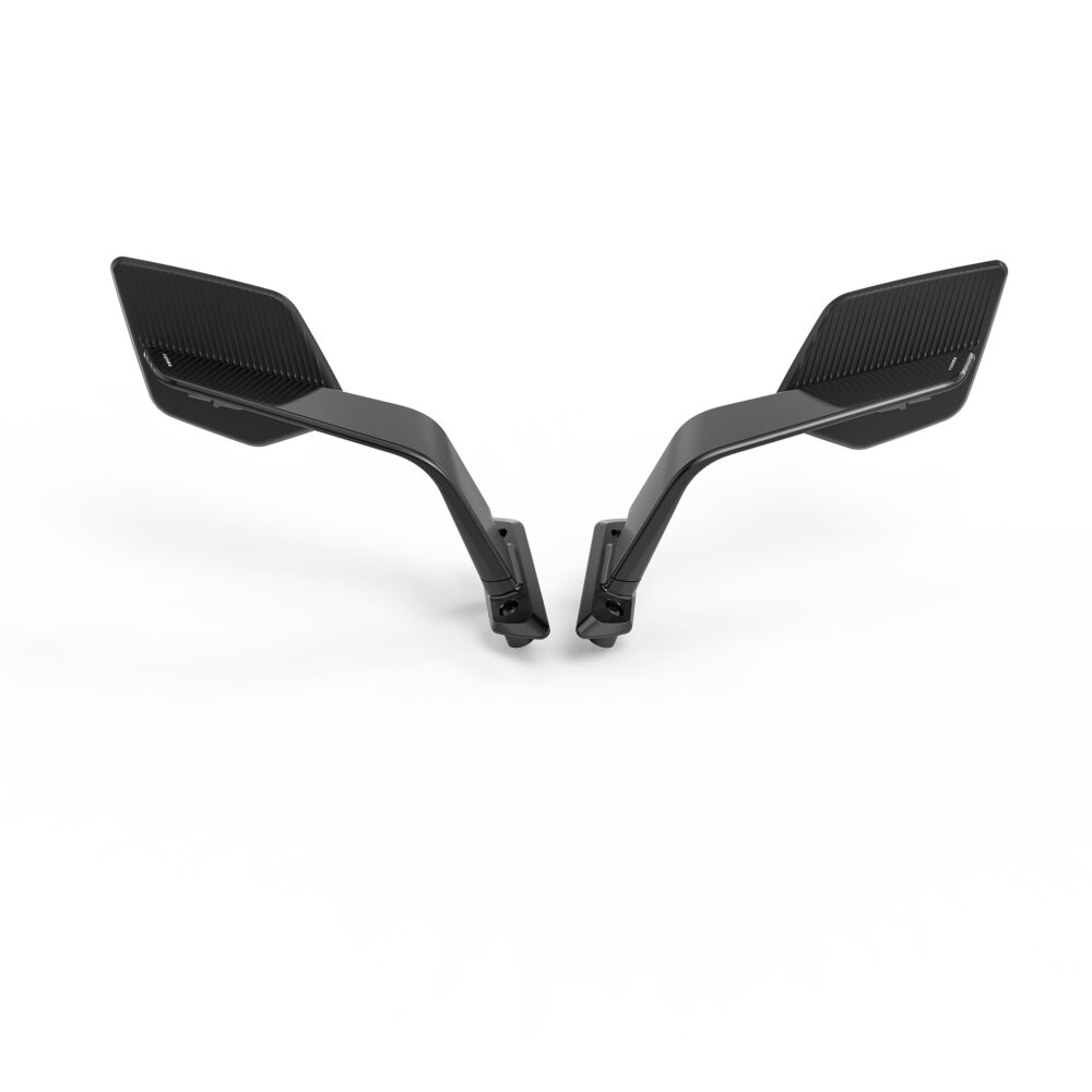 Los espejos Stealth están diseñados con vidrio de alta definición. Su geometría convexa, combinada con una superficie tintada en azul, ofrece visibilidad excepcional, con un área reflectante de 7544 mm² para una mayor seguridad y precisión. Fabricado con aluminio de alta calidad y tecnopolímero, combina materiales de alto rendimiento.