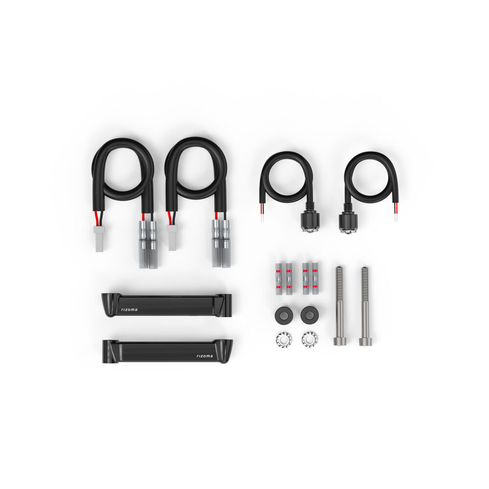 En el caso de la sustitución de los espejos retrovisores OEM, que prevén intermitentes integrados de serie, con espejos Rizoma sin intermitente integrado, es posible restaurar esta función mediante el Kit de intermitentes delanteros Rizoma Light Unit.