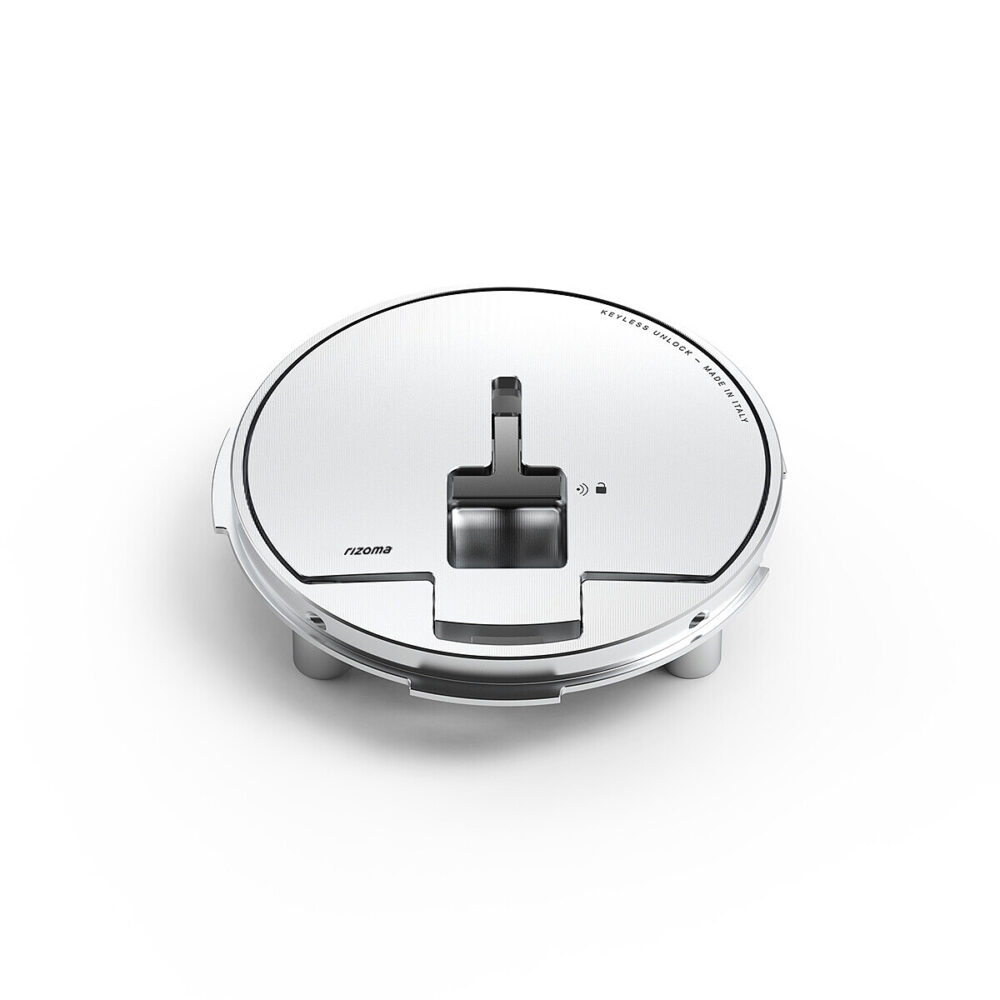 El tapón de depósito de gasolina de Rizoma, realizado totalmente en aluminio mecanizado a partir de un bloque macizo, fusiona diseño, tecnología, alta calidad de materiales y seguridad. El accesorio Rizoma ofrece la función de apertura automática, sin pulsar ningún botón, gracias al reconocimiento de la llave del vehículo. El propietario es reconocido al acercarse a su motocicleta gracias a un transponder RFID integrado en la llave y un receptor integrado en la tapa a juego. De esta forma, se posibilita la apertura y cierre del tapón con solo levantar el asa de este último.