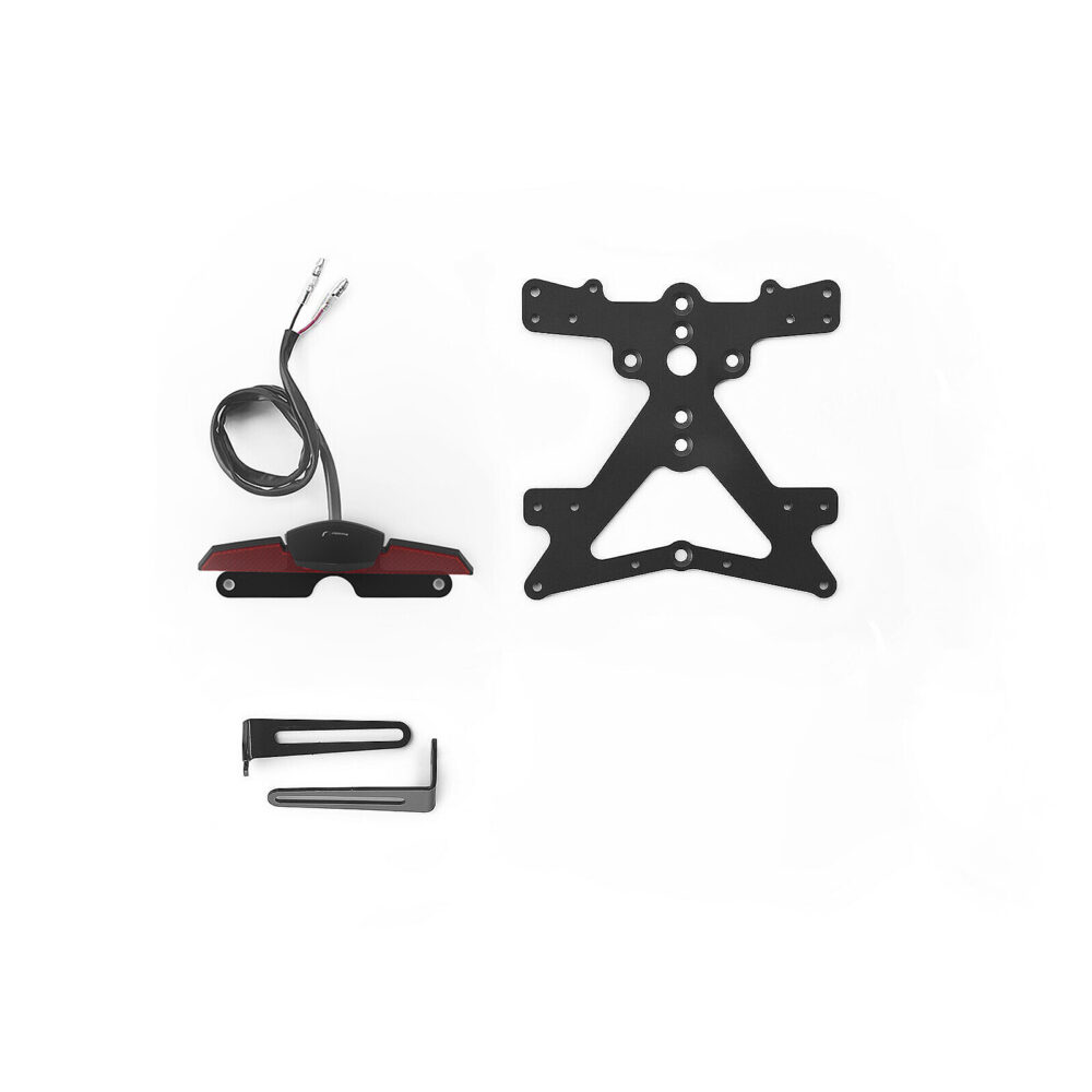 Kit con placa de soporte de matrícula de 173 x 173 mm, soportes para intermitentes Rizoma, luz de matrícula LED SMD (homologada) y catadióptrico.