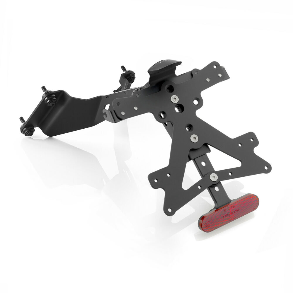 Kit con placa de soporte de matrícula de 173 x 173 mm y placa de tipo USA de 166 x 89,5 mm, soportes para intermitentes Rizoma, luz de matrícula LED SMD (homologada) y catadióptrico.