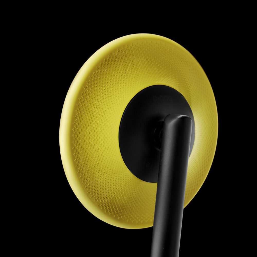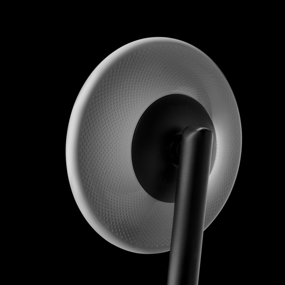 El e-pop se caracteriza tanto por líneas limpias y esenciales como por las exclusivas y cautivadoras variaciones de color. El Team de R&D ha renovado la forma redondeada clásica agregando dinamismo al diseño en general, a fin de expresar la visión de Rizoma al reinventar la forma de ver y experimentar la movilidad. El vástago de e-pop es de aluminio anodizado negro y se combina con un soporte de vidrio tecnopolímero, enriquecido por la particular textura Altera. El e-pop se puede montar con el espejo mirando hacia arriba o con el espejo hacia abajo desde el manillar, para reflejar mejor la personalidad de su piloto. En ambos casos, la gran superficie reflectante, que cumple con las normas europeas de homologación, ofrece una excelente visión.
