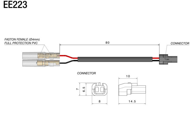 Il est conseillé de vérifier les dessins techniques avant l’achat. Chaque kit comprend 2 câblages et 6 connecteurs T-Tap. Pour monter 4 clignotants, il est nécessaire d’acheter 2 kits.