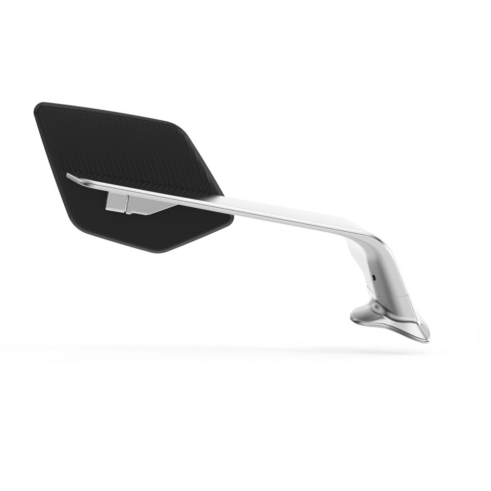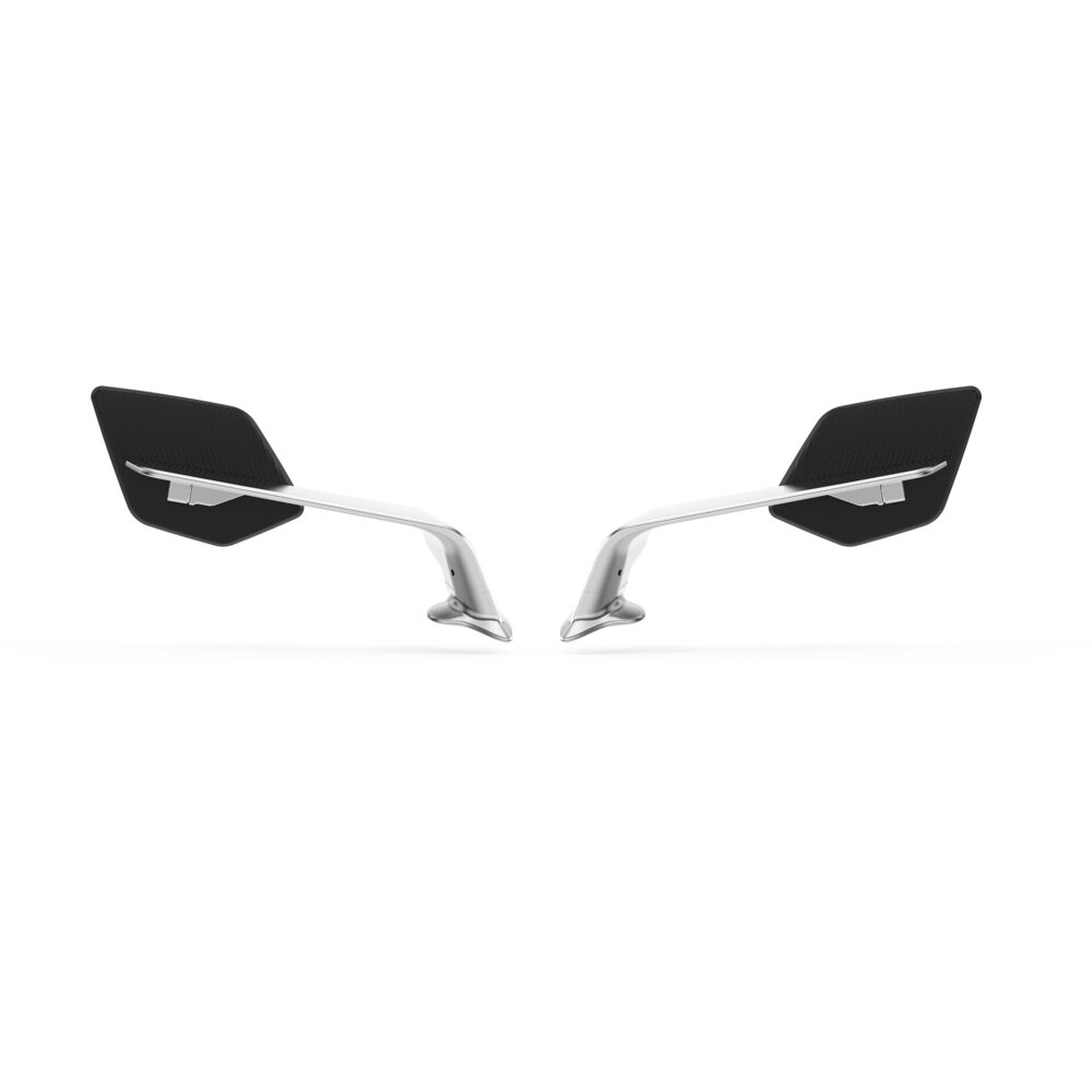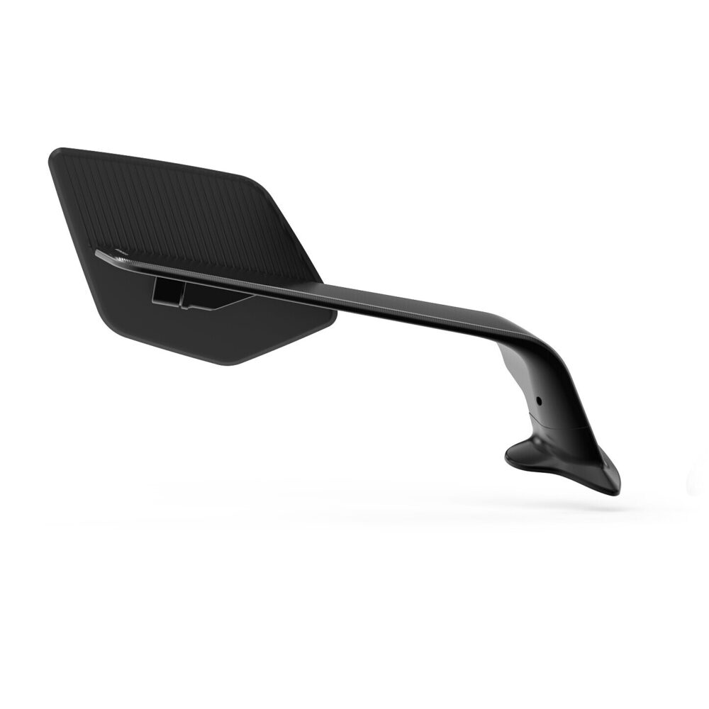 Corps en aluminium usiné dans la masse et anodisé, support de miroir en technopolymère avec une texture spécialement étudiée pour améliorer les performances aérodynamiques.