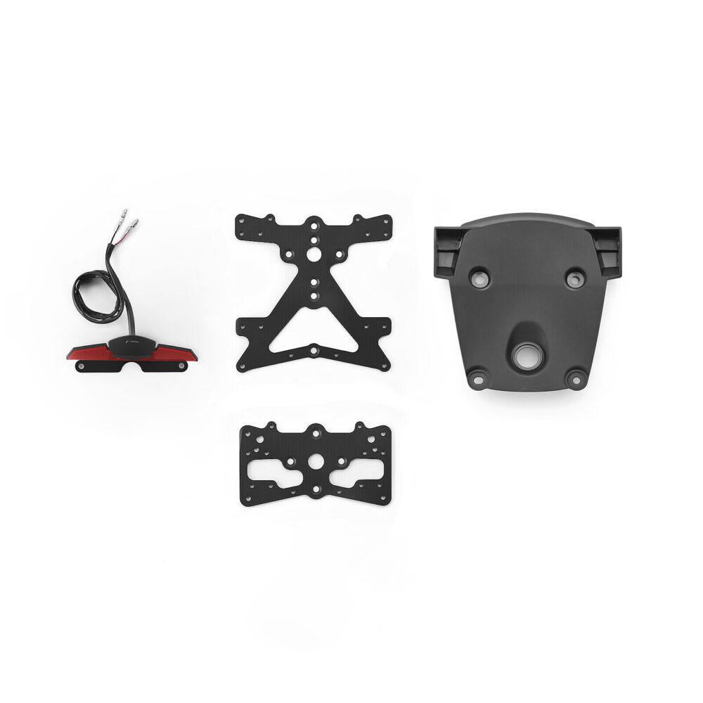 Kit avec support de plaque 173x173 mm, support de plaque USA 166x89,5 mm, éclairage de plaque d’immatriculation à LED SMD (homologué), et catadioptre. Le kit comprend le cache dessous de selle.