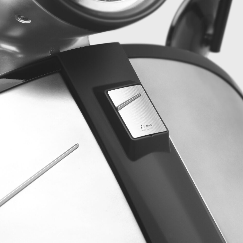 L'inserto logo per cravattino OEM è in alluminio ricavato dal pieno. Un dettaglio di puro design, che enfatizza l'impatto visivo frontale e si abbina perfettamente all' Icon Tag V per pance laterali nella parte posteriore, creando un'elegante continuità stilistica. Disponibile nelle varianti colore black e silver con laserature a contrasto.