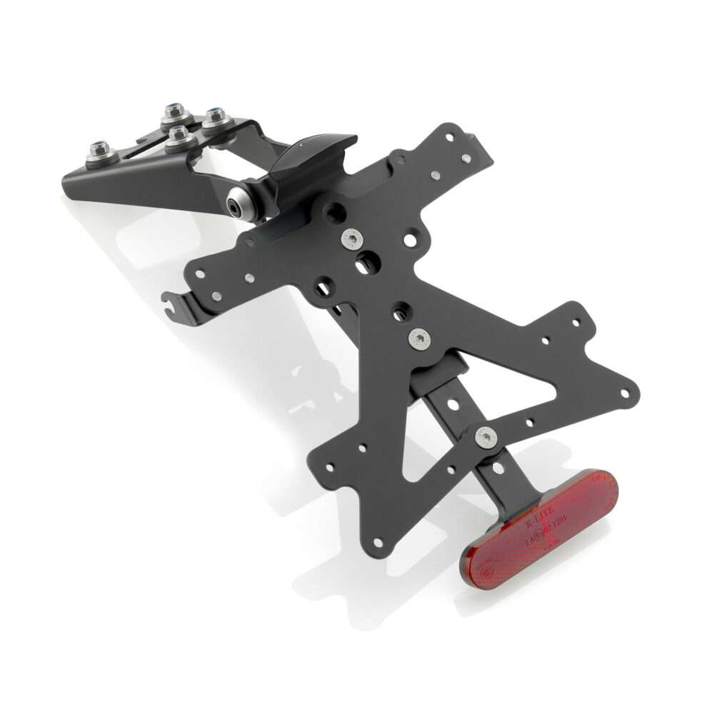 Kit completo di piatto targa 173x173 mm, piatto targa USA 166x89,5 mm, supporti per indicatori di direzione Rizoma, luce targa LED SMD (omologata) e catarifrangente.