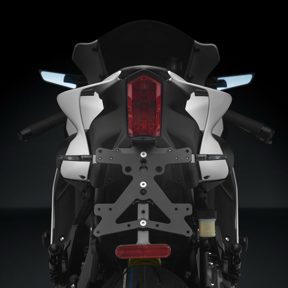 Kit completo di piatto targa 173x173 mm, piatto targa USA 166x89,5 mm, supporti per indicatori di direzione Rizoma, luce targa LED SMD (omologata) e catarifrangente.