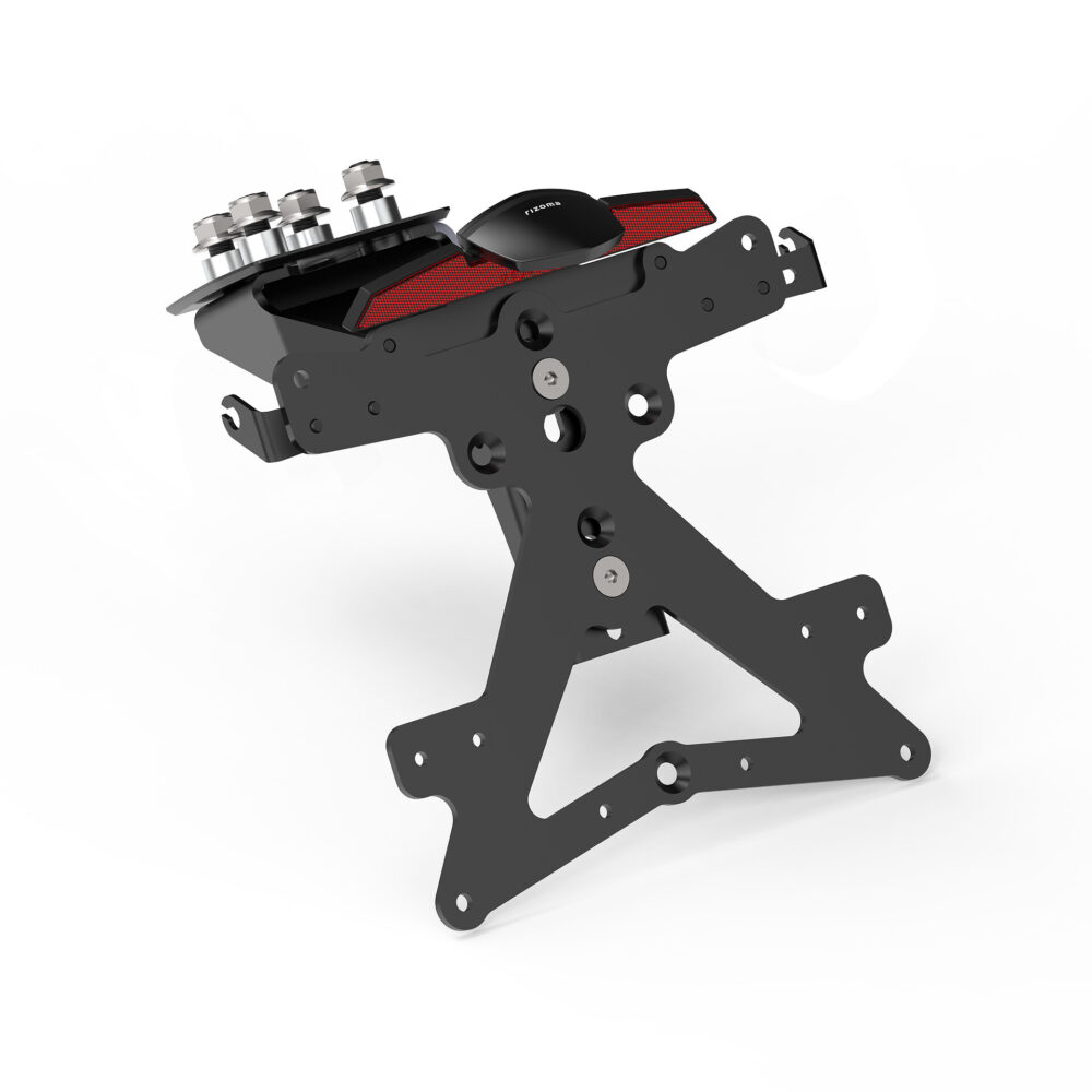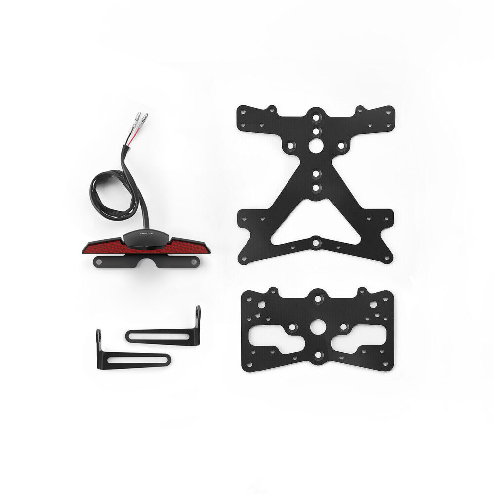 Kit completo di piatto targa 173x173 mm, piatto targa USA 166x89,5 mm, supporti per indicatori di direzione Rizoma, luce targa LED SMD (omologata) e catarifrangente.