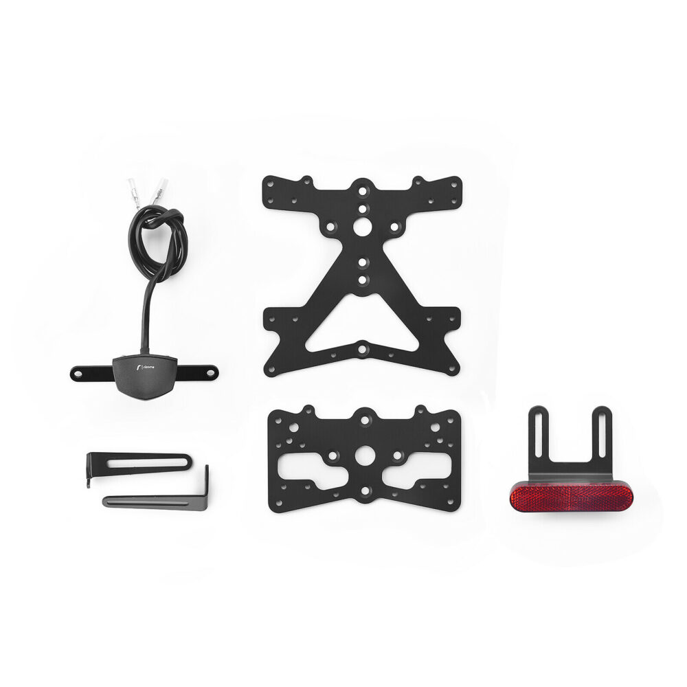Kit completo di piatto targa 173x173 mm, piatto targa USA 166x89,5 mm, supporti per indicatori di direzione Rizoma, luce targa LED SMD (omologata) e catarifrangente.