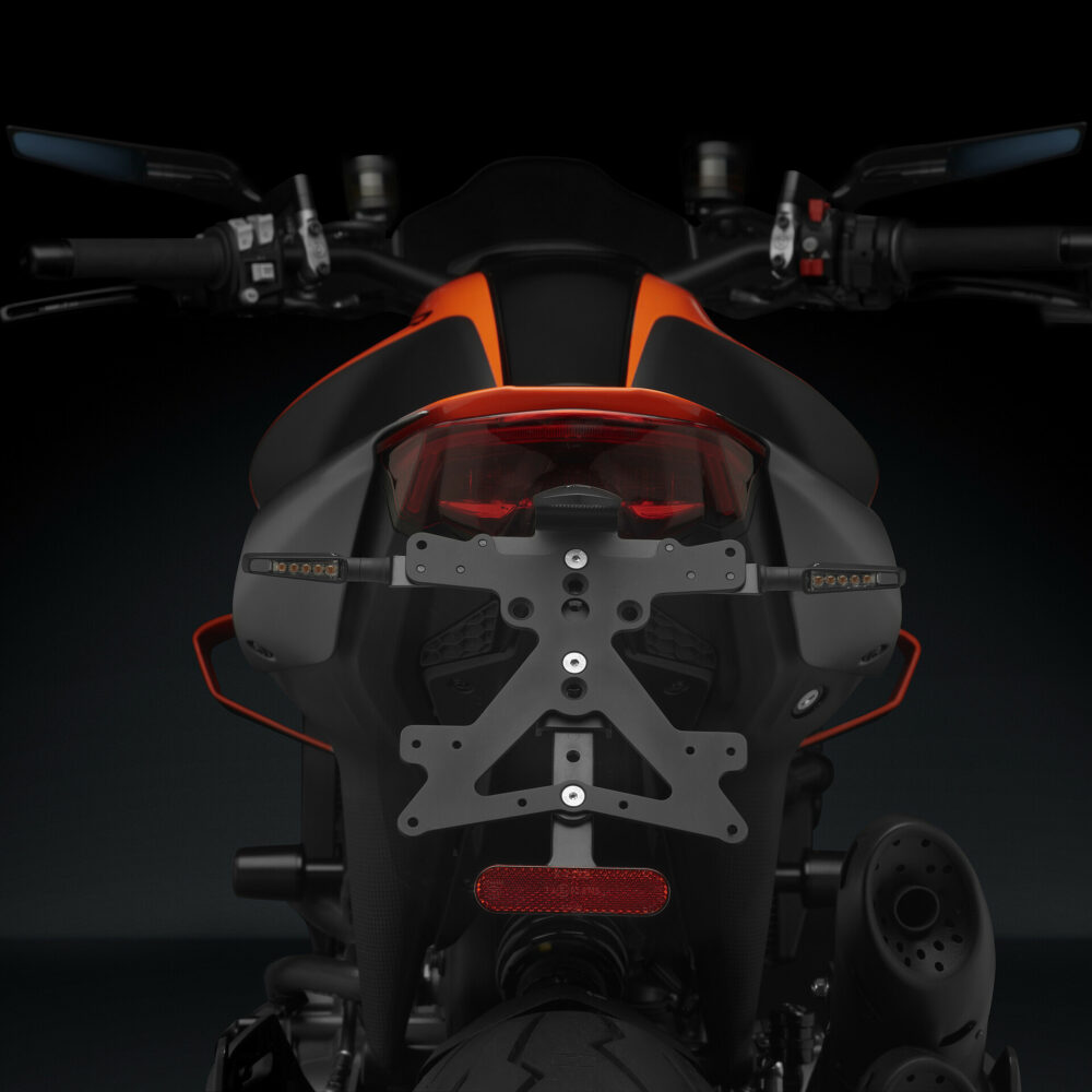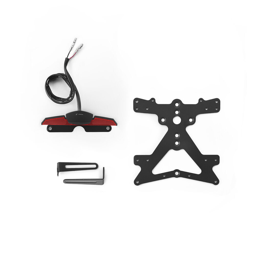 Kit completo di piatto targa 173x173 mm, supporti per indicatori di direzione Rizoma, luce targa LED SMD (omologata) e catarifrangente.