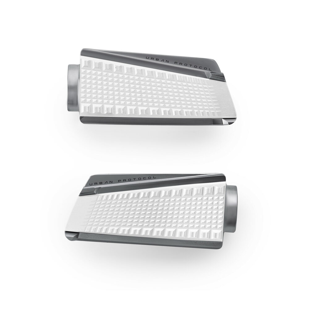 Il design innovativo di questo accessorio è dato da una doppia anodizzazione e dalla particolare tecnica di finitura a sfumare. La base della pedivella è più ampia per ottenere una maggiore ergonomia e comprendere una placchetta centrale antiscivolo sostituibile, caratterizzata dalla finitura a contrasto a pin dentati che ne evidenzia l'area di grip. Uban Protocol si si adatta perfettamente alle moto Custom e New-Retrò ed è dotata di certificazione TÜV.