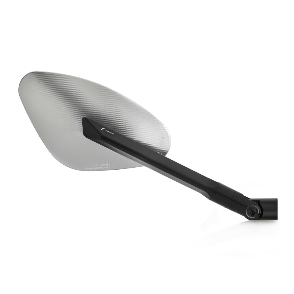 Lo specchio retrovisore Genesi è realizzato in alluminio ricavato dal pieno attraverso lavorazioni 3D di precisione e sottoposto a trattamento superficiale di anodizzazione, che garantisce qualità e durata nel tempo. L'ampia superficie riflettente, conforme agli standard omologativi europei, offre un'ottima visuale. Il vetro convesso e asferico, ha proprietà antiabbaglianti e idrorepellenti. Disponibile in differenti colorazioni.