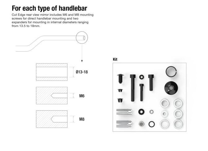 Gli specchi retrovisori Cut Edge, grazie al kit di viteria ed expander inclusi, sono compatibili con tutti i manubri che all'estremità presentano una filettatura M6 / M8 e con manubri di diametro interno da 13,5 mm a 18 mm. All’interno della confezione, inoltre, sono presenti distanziali da interporre tra manopola dell’acceleratore e specchio, per creare il gap necessario a garantire la rotazione.